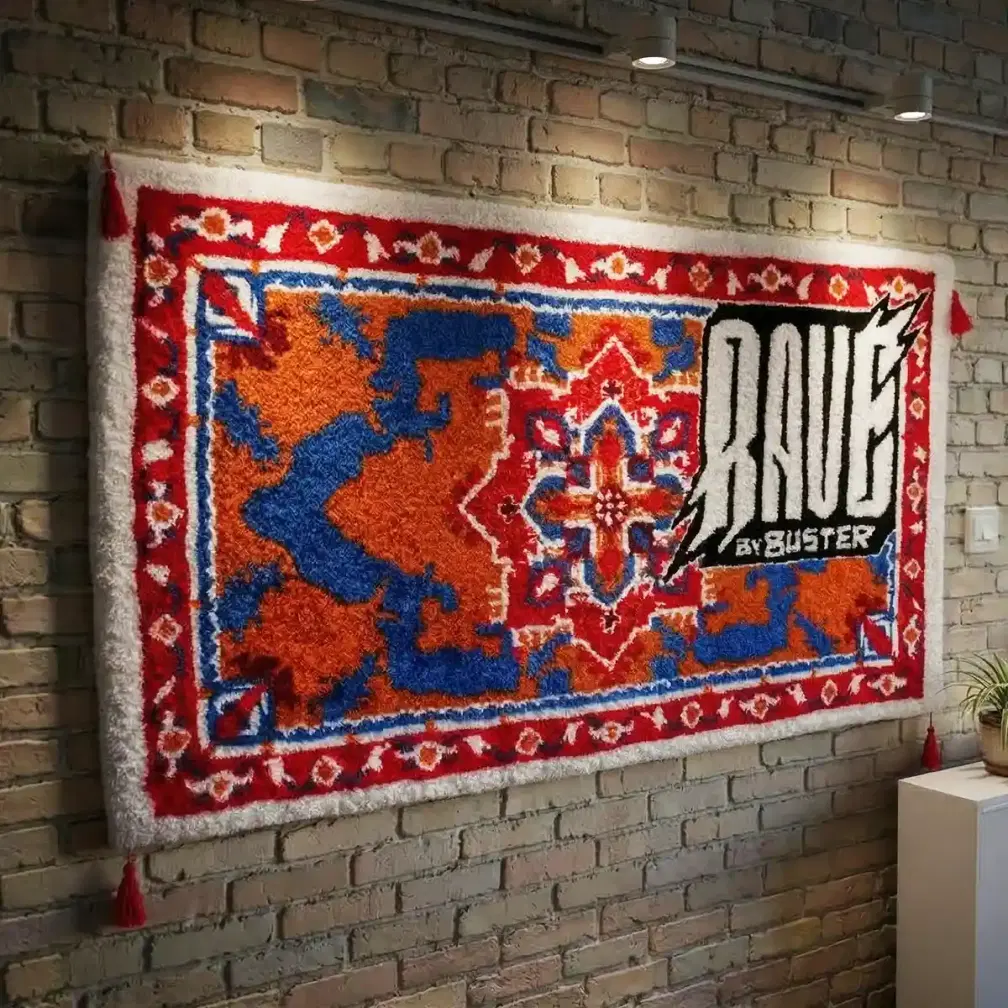 Но в этом проекте традиция неожиданно сталкивается с современным графическим элементом — логотипом RAVE by BUSTER. Контраст между классическим орнаментом и смелой типографикой делает ковер не просто декоративным предметом, а полноценным арт-объектом. Он одновременно напоминает о культурном наследии и выглядит как современный дизайнерский элемент интерьера.
