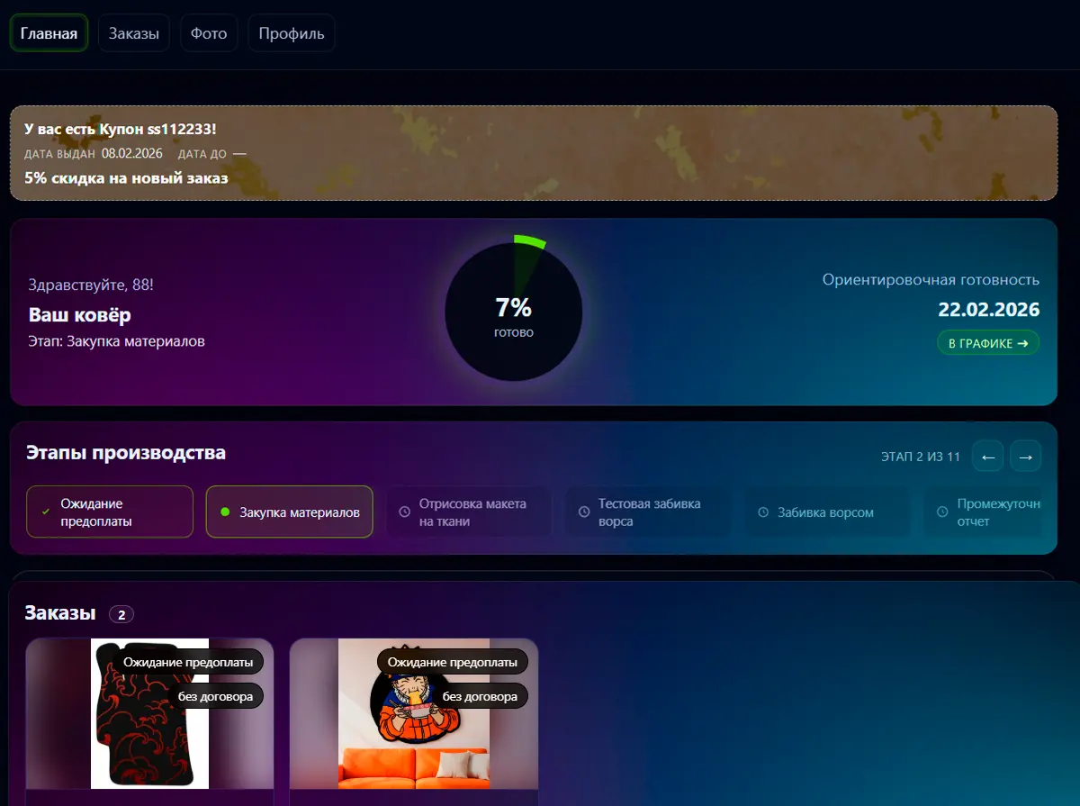 Теперь клиенты ДУО✌ГУРУ могут в реальном времени следить за изготовлением своего ковра через личный кабинет: фото процесса, этапы работ и сроки — всё в одном месте.