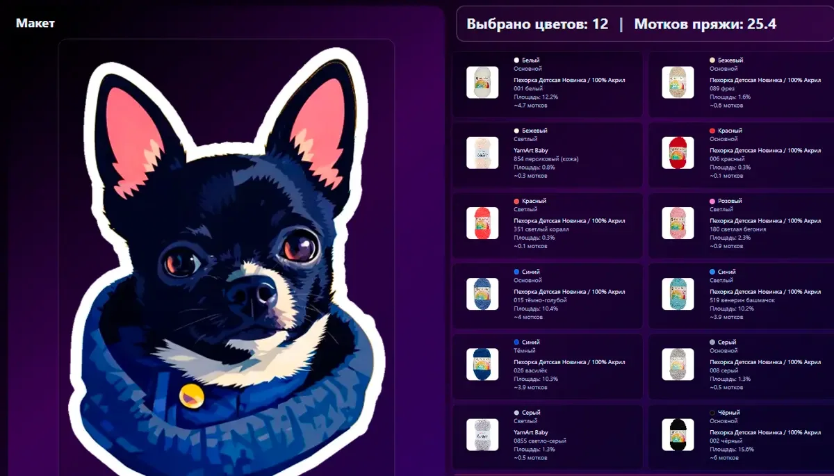 Одно из главных преимуществ такой услуги — автоматический подбор цветов пряжи. Система помогает максимально точно определить подходящие оттенки, чтобы готовое изделие было как можно ближе к оригинальному изображению. Это особенно важно для сложных рисунков, портретов, логотипов, персонажей и ярких дизайнерских идей, где точность цвета играет ключевую роль.